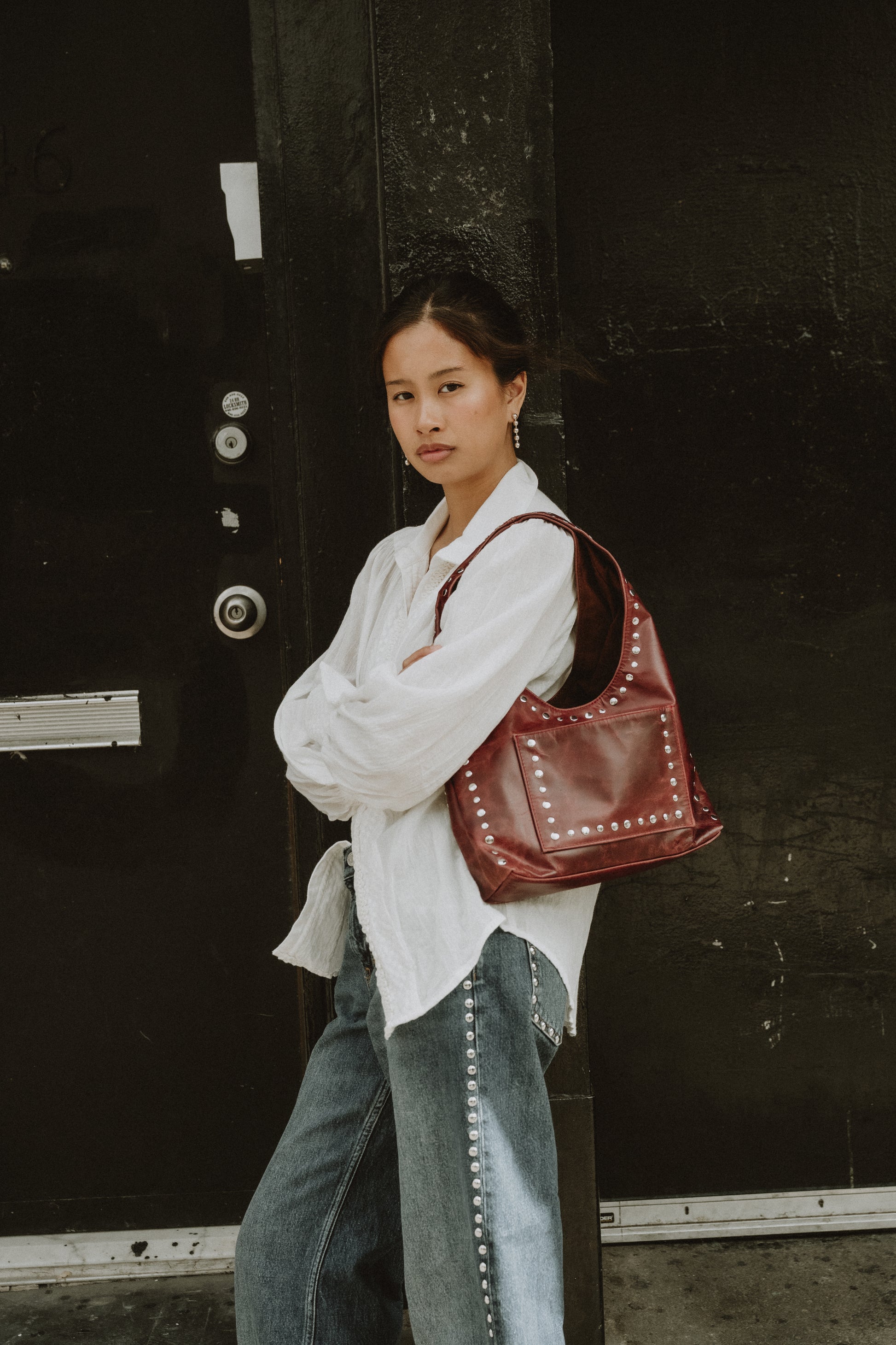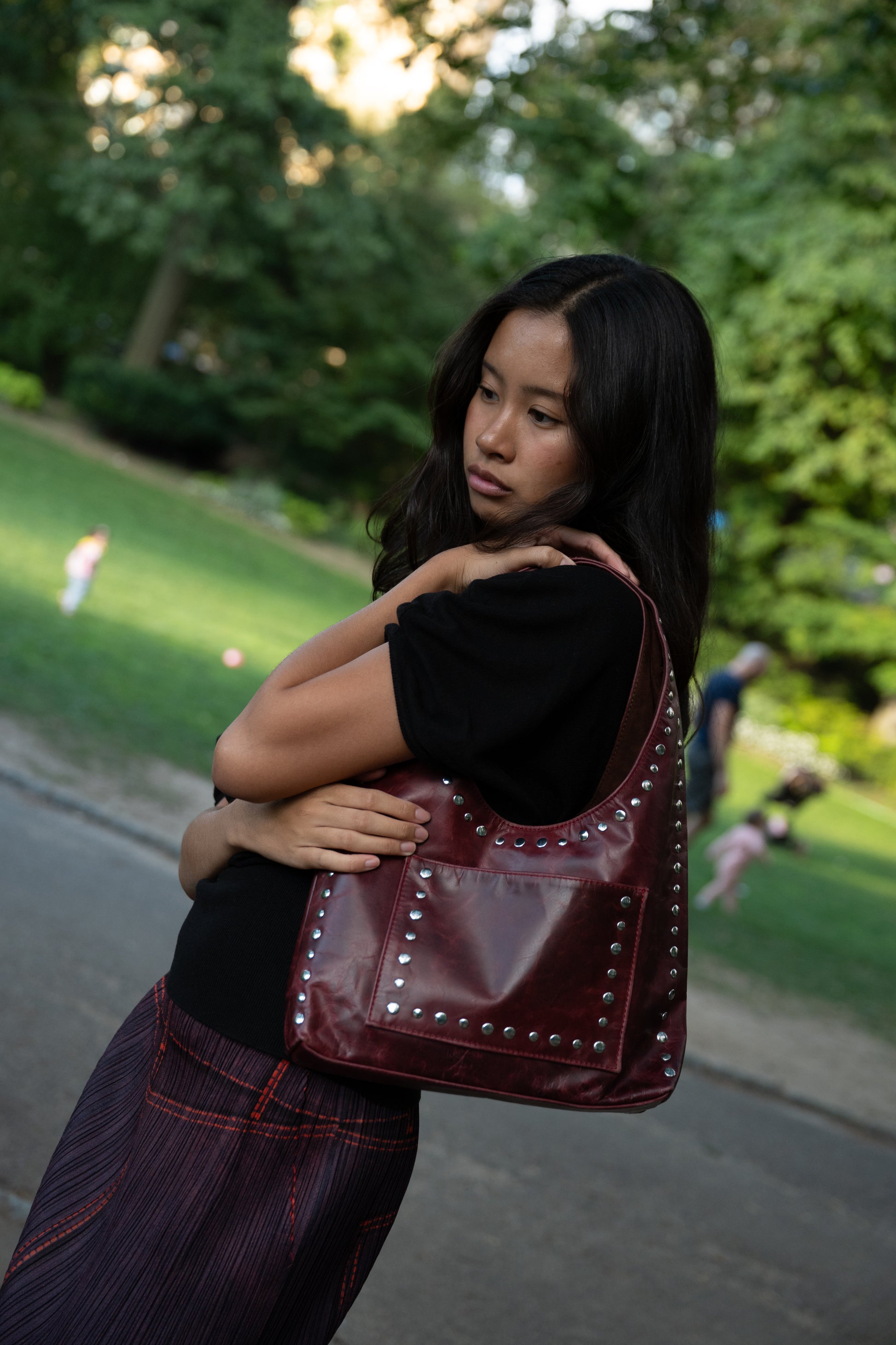 Finished in a deep merlot- crumple finish (wax and oil), Halston redefines statement accessories—bold, functional, unforgettable.