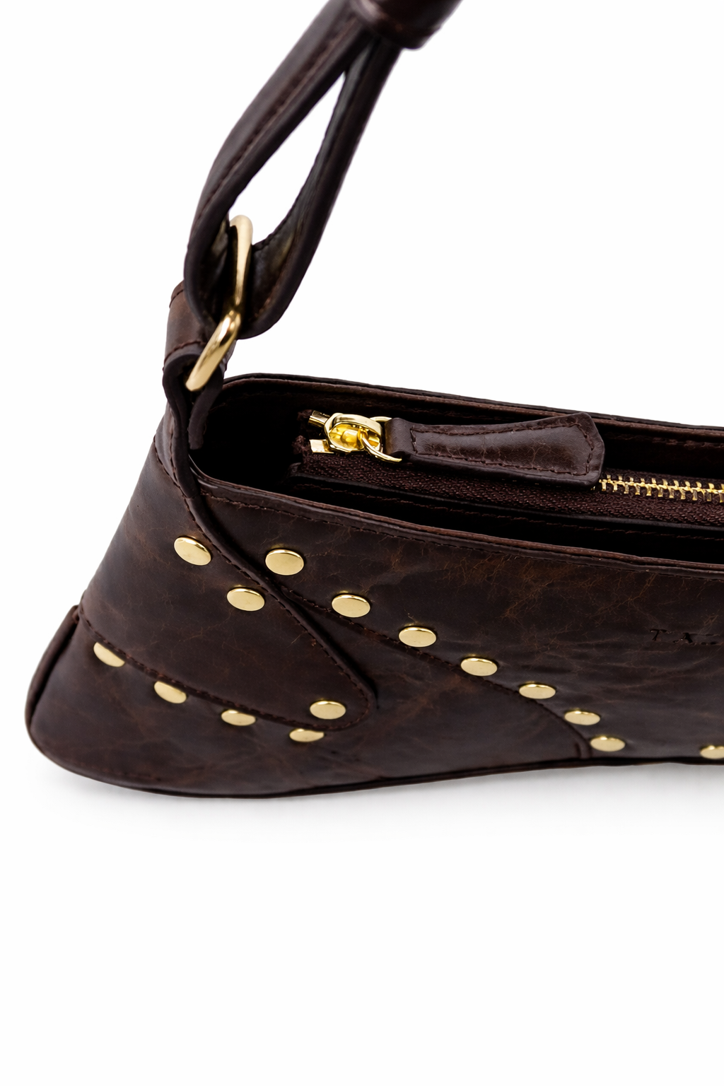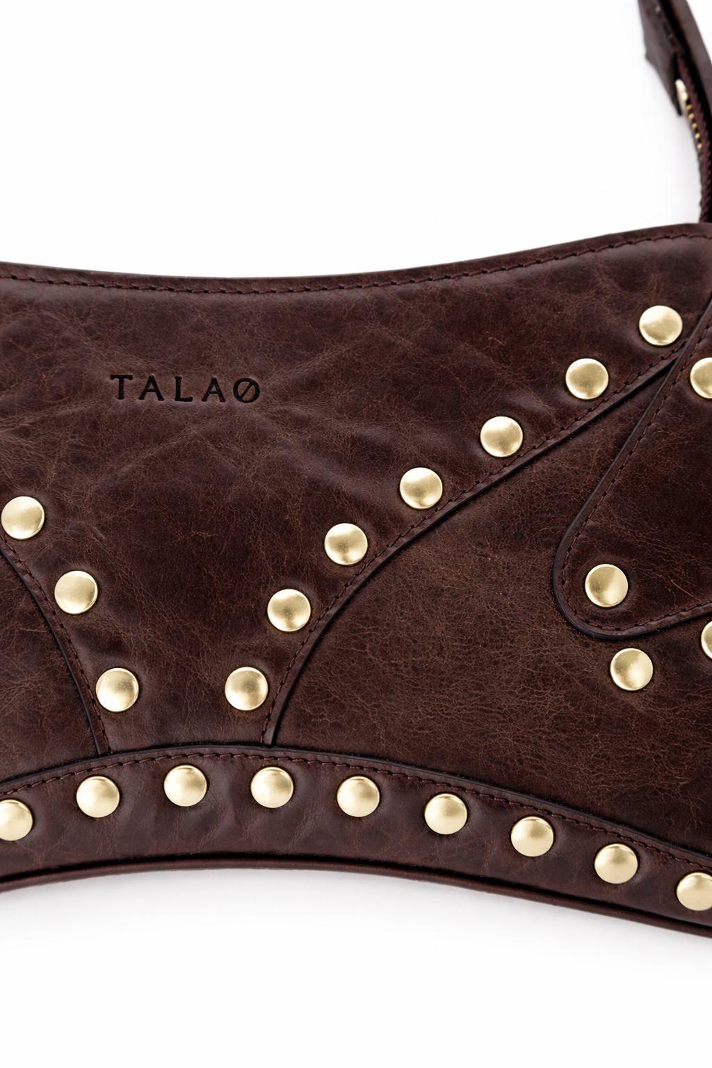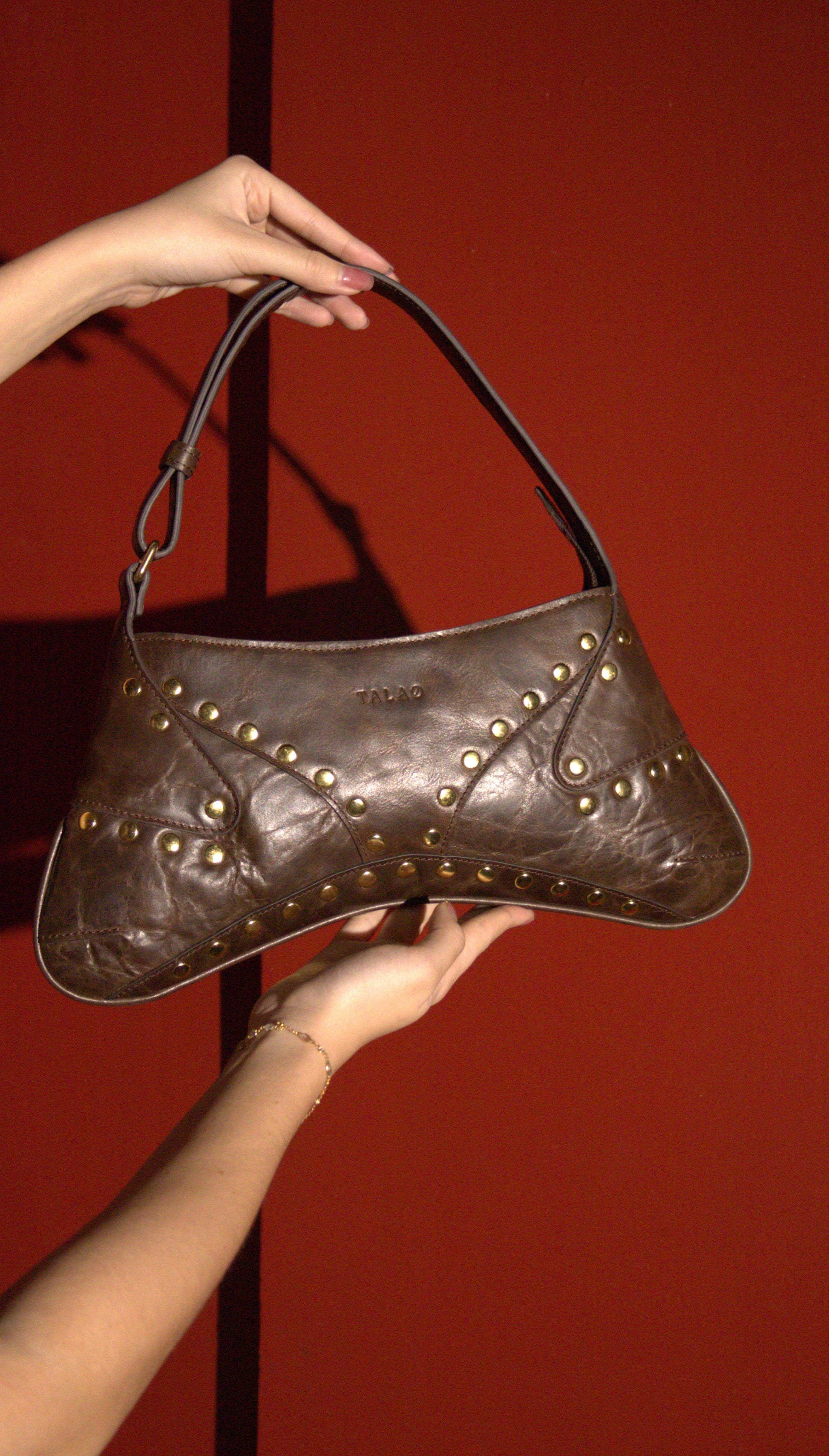 Crafted in rich brown full-grain leather and finished with solid brass rivets, this sculptural shoulder bag blends softness with structure in all the right places. Its curved silhouette sits effortlessly under the arm, while the studded detailing adds a quiet boldness—refined, never loud.